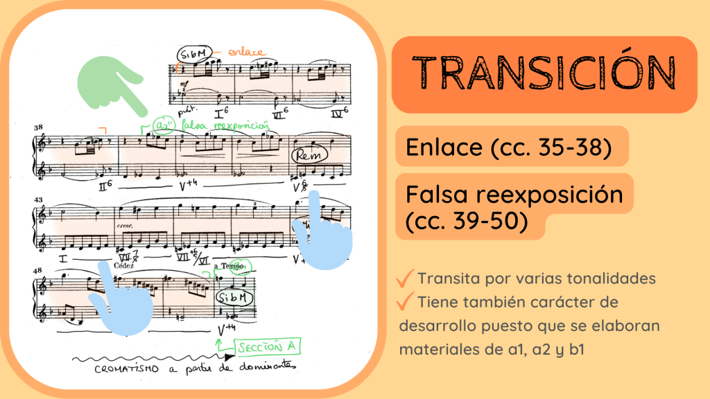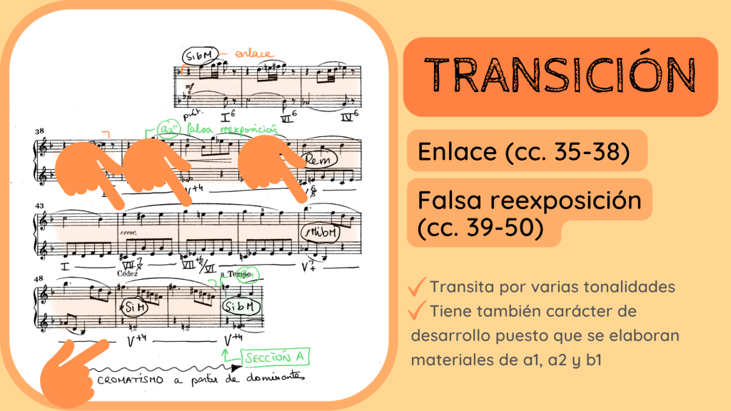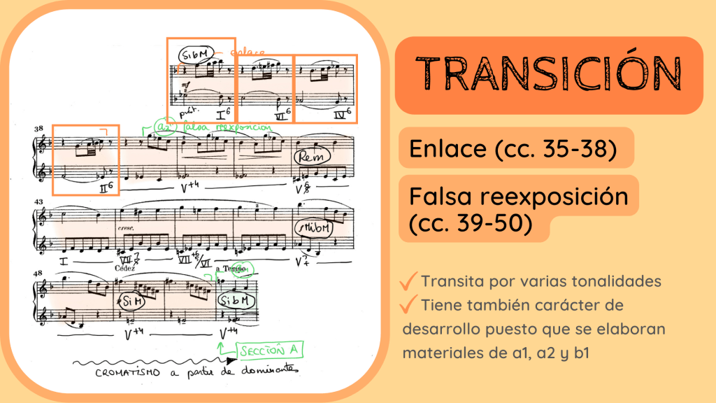 Aunque la he llamado transición, también podría considerarse esta nueva parte como un desarrollo puesto que aparecen los elementos de las secciones A y B anteriores. El cambio de sección además estaba marcado por una doble barra en la partitura. Como muchas formas sonatas, el desarrollo empieza con el material del inicio transformado. Al tratarse de la anacrusa con carácter de dominante tónica, Bonis juega con ese efecto y realiza una progresión en la que va realizando resoluciones sobre los grados I, VI, IV y II de la tonalidad de Si♭ Mayor (subdominante, por cierto, de la tonalidad principal). La progresión es por terceras, resuelve sobre los acordes en primera inversión de Si♭, Sol, Mi♭, Do. Las notas alteradas de la melodía se van adaptando a las tonalidades por las que pasan como dominantes secundarias. Es decir, en el c. 36 Sol menor (con ese Mi-Fa#), en el c. 37 es Mi♭ Mayor y en el c. 38 es Do menor (La-Si). Vaya, que está haciendo fragmentos de las escalas mayores o escala menor melódica ascendente.