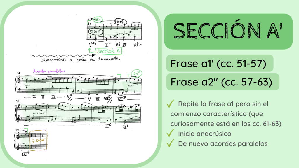 Con la vuelta al material melódico principal vuelve también la tonalidad de Fa Mayor. El inicio melódico está cortado, surgen esas negras pero faltan los ritmos característicos del inicio, de corchea con puntillo y fusas. Están, pero no ahí, sino más tarde, en los cc. 61-62, curiosamente cerrando la Sección. Ha realizado Bonis una especie de Reexposición invertida de la sección A.
