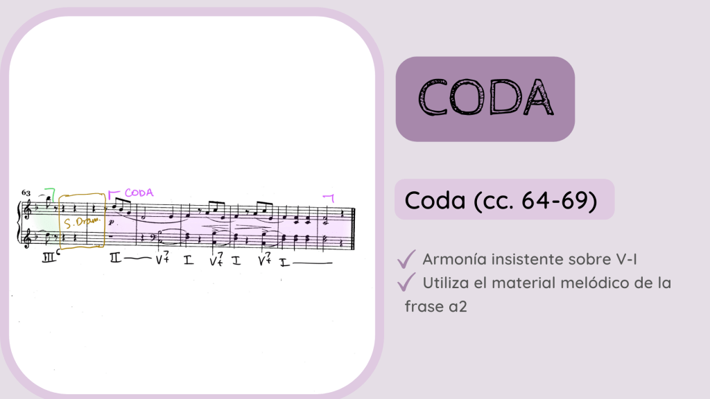 Tras el silencio aparece pues la Coda, con una armonía muy clara y conclusiva sobre los acordes de V y I de Fa mayor.