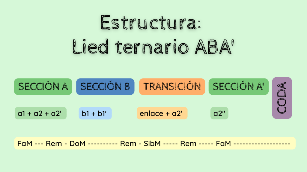 Así concluiría este análisis. Aquí os dejo, como siempre, con este esquema en el que podéis observar el planteamiento tonal de la pieza. Se ve así como se trata de una forma de Lied Ternario. Y recuerdo que, como ya he dicho antes, la sección de transición que he marcado podría perfectamente considerarse como un breve desarrollo insertado entre la sección B y la reexposición de la sección A.