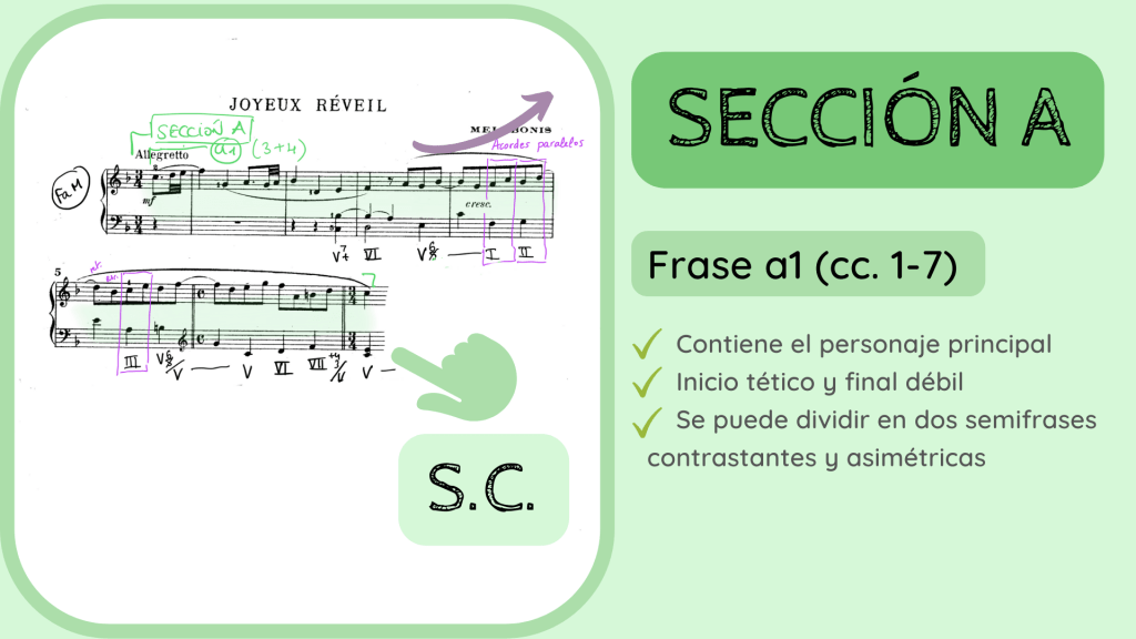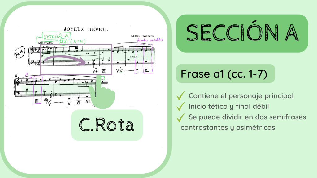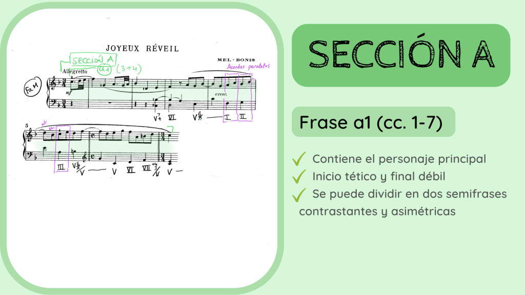 En esta primera frase, que he llamado a1, Bonis establece la tonalidad de Fa Mayor y uno de los dos materiales melódico-rítmicos protagonistas. Encontramos en su inicio esa anacrusa de dominante resolviendo en tónica, tan común en la música: la anacrusa de do a fa. Tiene una estructura binaria, pudiéndose dividir en dos semifrases asimétricas y contrastantes.