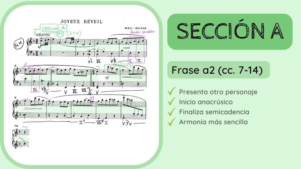 Esta segunda frase es el otro elemento protagonista, a2. Al contrario que el carácter mayormente diatónico -de nota a nota- de la melodía a1, esta nueva frase a2 contiene saltos. De hecho se trata de acordes desplegados. La armonía está formada mayormente por el acorde de séptima de dominante y aquí sí, acaba resolviendo de forma más clara en los cc. 11-12 a tónica, aunque en los tiempos débiles del 3/4… Además en el c. 11 se añade un Fa# como nota cromática para que la sensación de resolución pierda también fuerza. De nuevo, la frase termina en el c. 14 sobre la dominante en suspensión, es decir, en semicadencia.