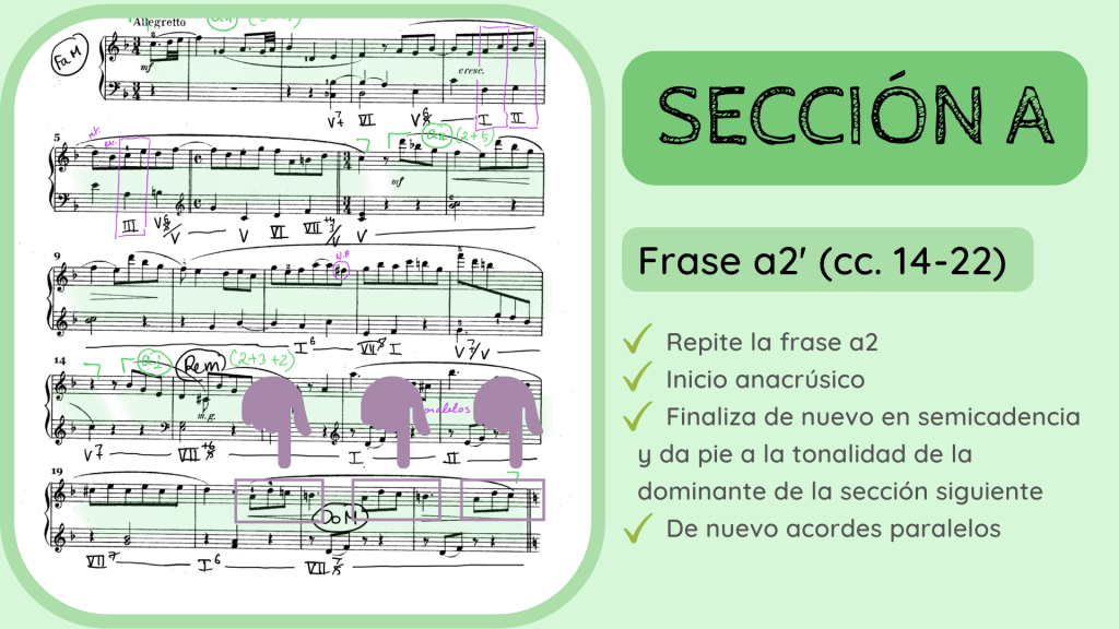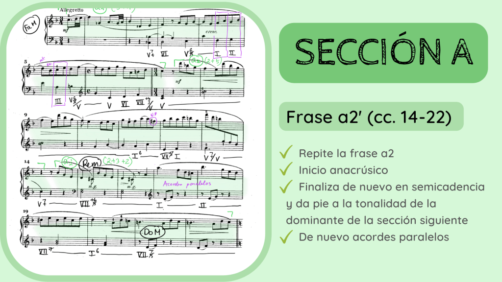 Se repite la frase a2 aunque ya con un carácter de transición puesto que, como se observa, la armonía se desplaza en el c. 15 con un Do# hacia la tonalidad de Re menor, el tono relativo de la tonalidad principal. Y después, en el c. 21 hacia la tonalidad de la dominante del tono principal, hacia Do Mayor, dando pie a la nueva sección que vendrá después.