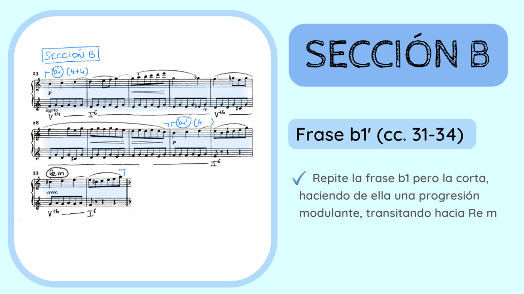 En la frase siguiente nos encontramos una fusión de elementos, primero los de la frase a2 (con la melodía en forma de acorde desplegado descendente) y después de la b1 (acompañamiento simple con melodía en negras diatónicas que ascienden). Realiza una modulación a Re menor en el momento en que aparecen los elementos de b1.