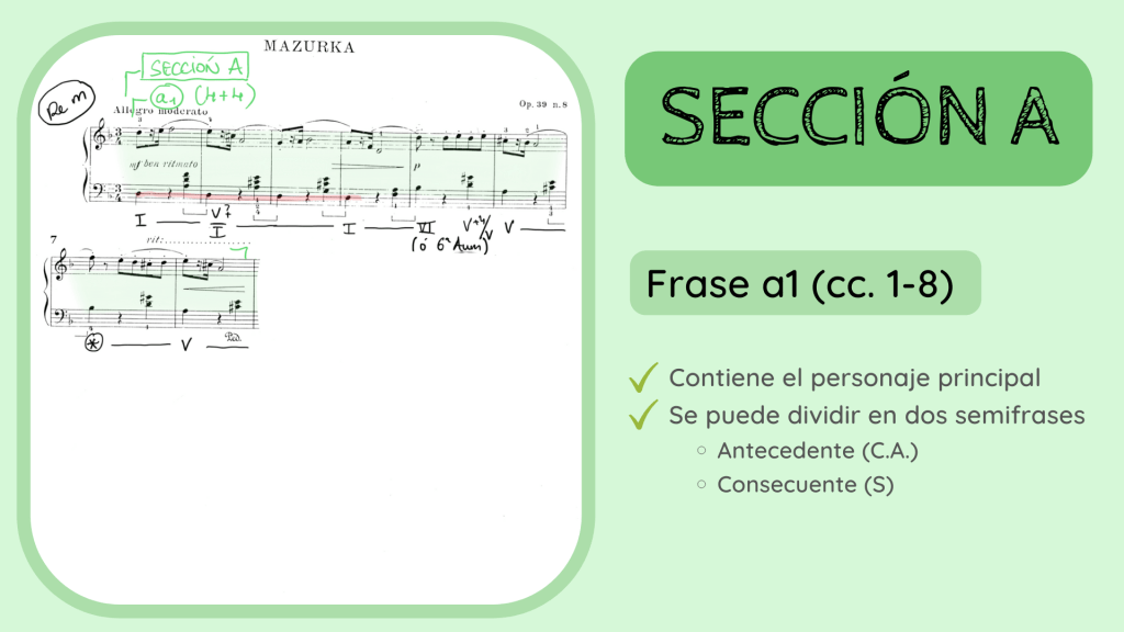 En esta primera frase, que he llamado a1, Chaikovski establece la tonalidad de Re menor y el material melódico-rítmico protagonista. El ritmo de mazurka que ves en el c. 1 estará posteriormente por toda la obra. La estructura de la frase es arquetípica, es decir, que encaja perfectamente con el modelo clásico de 4 + 4. Es por ello que he podido hacer una subdivisión en dos semifrases (recuerda que no siempre será posible subdividir el fraseo de una obra, dependerá mucho del estilo en el que fue compuesta). Esta primera frase, además, se queda en suspensión puesto que termina en semicadencia.