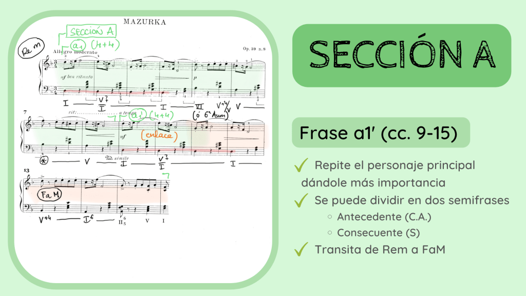En esta segunda frase se repite el mismo tema, el protagonista. Por eso llamo a la frase a1’. Ojo a la repetición, no es casualidad, Chaikovski quiere darle importancia como elemento principal. Pero, si te fijas, la segunda semifrase acaba modulando al tono relativo de Fa Mayor en el c. 13, cuando aparece el Do natural. Fa mayor se confirma con el proceso cadencial de II con séptima, V y I. Concluye así esta primera Sección A, conformada por un periodo de dos frases: a1 y a1’. Toda la Sección A tendrá una clara función expositiva y una textura de melodía acompañada.