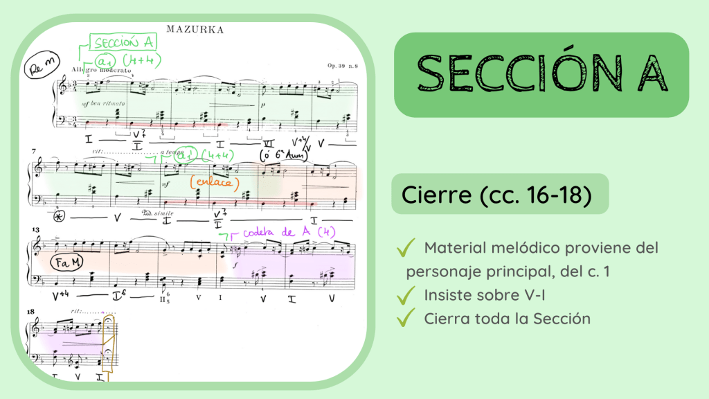 Pero, ¿qué hacemos con estos tres compases que sobran hasta el calderón? Esta pausa sin duda divide la Sección A de la siguiente Sección B. Pues la respuesta es sencilla si os fijáis en la armonía, que resulta una insistencia sobre el V-I de Fa Mayor. Puede que estéis pensando que en los cc. 16-18 hay varias alteraciones extrañas. Y sí, las hay, pero no son relevantes armónicamente puesto que son muy breves (de semicorchea) y, además, impulsan los acordes de negra que vienen después de ellas. Por tanto, estos últimos compases tienen función conclusiva: cierran y concluyen toda la sección, una Sección de cierre. De hecho, pensad que sin estos tres compases la Sección A se habría cerrado igualmente con su propia Cadencia Auténtica.