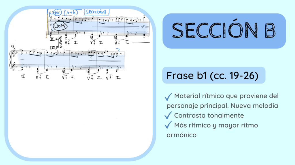 Tras la pausa del calderón, por cierto, como silencio estructural se comienza una nueva frase, estable en Do Mayor. Esa estabilidad tonal hace que se pueda considerar una nueva Sección B con un material melódico distinto, aunque muy similar rítmicamente al protagonista a. El contraste de la frase b1 con respecto a la Sección anterior lo encontrarás en el ritmo y en la textura, que por decirlo de alguna manera, tiende más hacia la textura homofónica. Parece que acompañamiento y melodía se funden buscando los mismos puntos de apoyo. Mencionar también el acorde puente del c. 19 puesto que la modulación real hacia Do Mayor no se hace evidente hasta que no aparece el Si natural en el acorde de séptima de dominante.