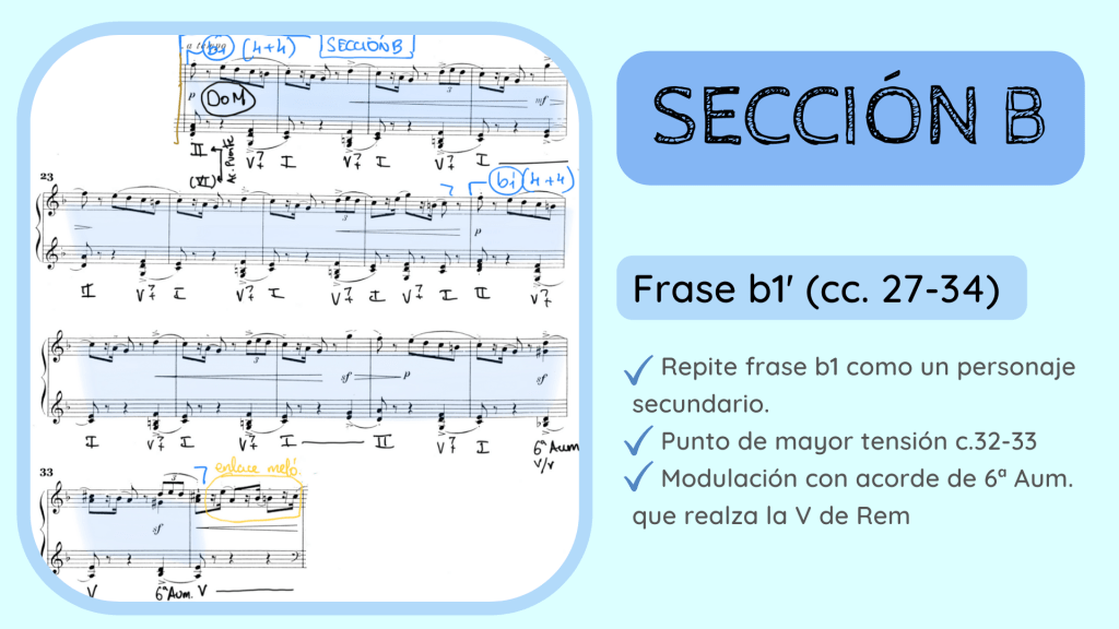 La repetición de la frase b no hace más que confirmar que estamos ante una nueva Sección. Armónicamente encontramos el punto clímax en los cc. 33-34 gracias al acorde de 6ª aumentada (otra vez francesa). De hecho este acorde permite modular hacia Re menor para preparar la reexposición y realzar el acorde de dominante (La-Do#-Mi). Toda la tensión armónica acabará resolviendo en el c. 35. El c. 34 presenta un pequeño enlace melódico que une la Sección B a la siguiente. Supone un engranaje entre el tiempo fuerte del c. 34 y el del c. 35, como un relleno para evitar un hueco de silencio indeseado.
