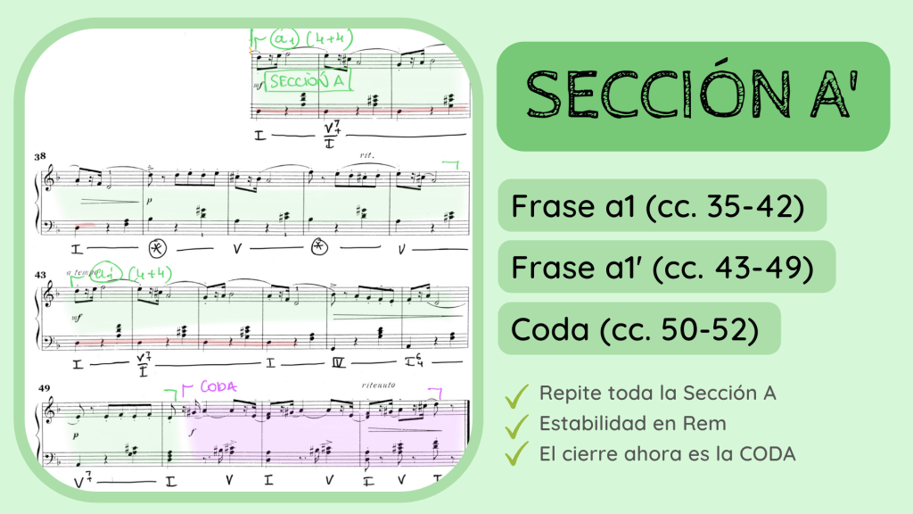 Con la repetición del material melódico principal y la vuelta a Re menor se confirma la Sección A’ que realiza de nuevo una función expositiva (o reexpositiva, como prefieras). Repite de nuevo las dos frases a1 y a1’ en forma de periodo cerrado armónicamente. Los tres compases finales que en la Sección A fueron la sección de cierre ahora se convierten en la Coda de la pieza, de nuevo con una función conclusiva.