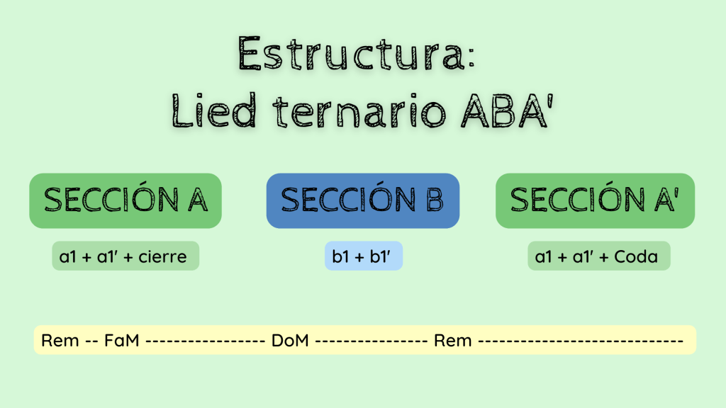 Se configura, por tanto, una estructura de Lied ternario ABA’. En este esquema podéis observar el planteamiento tonal y formal. Una forma clara, muy en la línea del objetivo de su composición: una pieza de un Álbum de la Juventud.