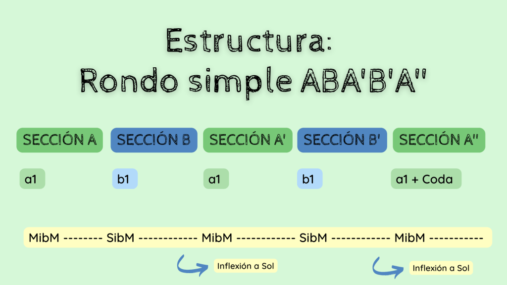 Se conforma así una estructura de Rondó, o también llamado Rondó simple ABA’B’A’’. En este esquema podéis observar también el planteamiento tonal. Se ve así como se trata de una pieza únicamente con secciones con funciones expositivas a excepción de la coda, con función conclusiva. Y para terminar, recordamos que las secciones, a pesar de ser muy breves, se han establecido como distintas por las tonalidades que tienen (a pesar de que como hemos podido observar, a nivel de melodía y ritmo son similares). Pero, en cualquier caso, pesa más la importancia de las modulaciones para definir la forma en una obra tonal.