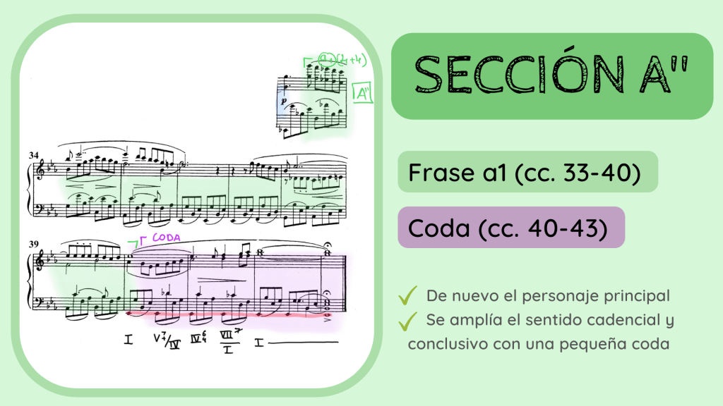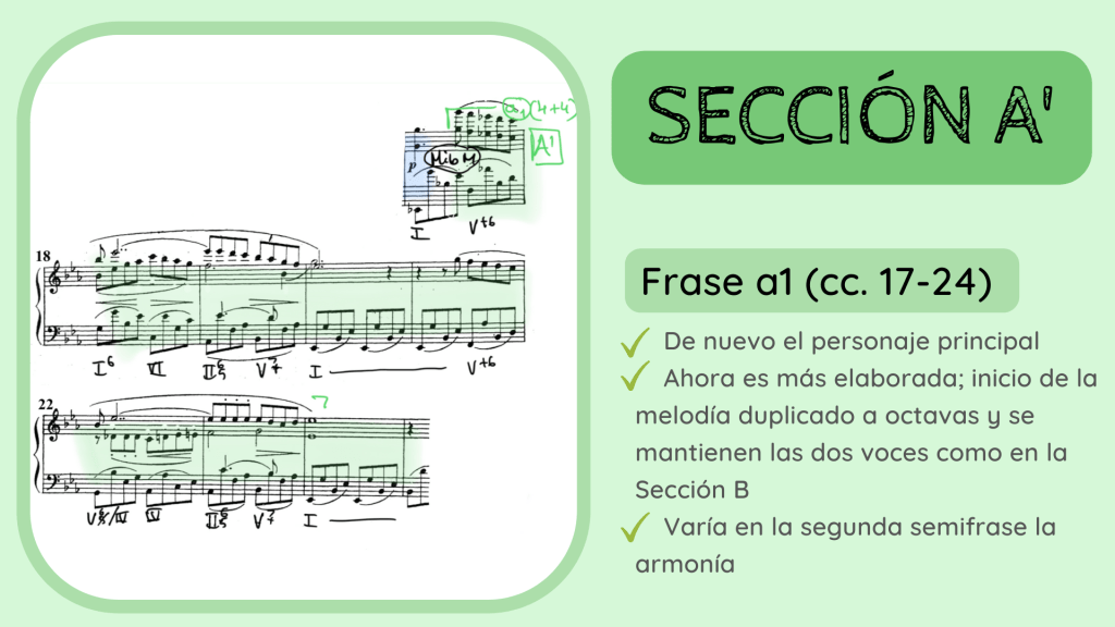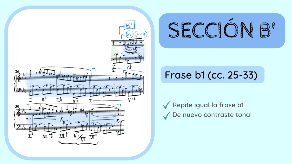 Tanto la melodía como la forma del acompañamiento provienen de la Sección A. Pero, no podemos considerar esta frase de la Sección A porque contrasta con la nueva tonalidad, y, como ya sabéis, el cambio de tonalidad implica cambio de sección.