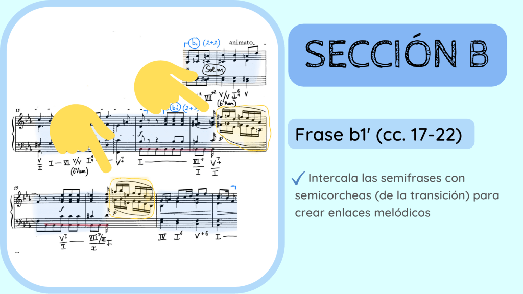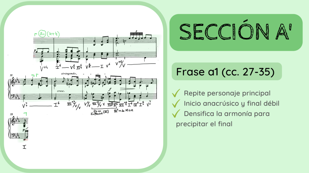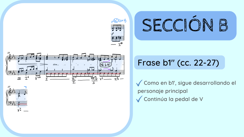 Nueva frase b1’’ ya que sigue reutilizando el mismo material melódico principal. Pero esta vez, la larga pedal de tónica de Sib Mayor, como era de esperar, se convierte en dominante para dar paso a la reexposición de la Sección A. Este cambio tiene lugar en el c. 26, mediante una serie de apoyaturas que van a parar al acorde de séptima de dominante de Mib Mayor.