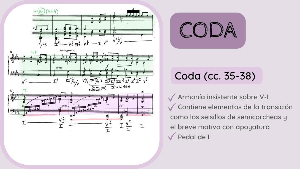 Esta breve coda de cuatro compases pone punto y final al segundo movimiento. Tiene alguna de las características más clásicas de una coda como la pedal de Tónica y la alternancia de las funciones tonales de V-I. Cabe destacar en el penúltimo compás el Dob como nota préstamo de Mib menor puesto que se trata de un acorde de séptima disminuida (recordad que este acorde se utiliza indistintamente en ambos modos). Por otro lado los seisillos de semicorchea que provienen del material de la transición aportan melódicamente un pequeño desvío hacia la sonoridad de Sol menor con las notas Fa# y La pero no se tratan más que elementos puntuales de cambio de color.