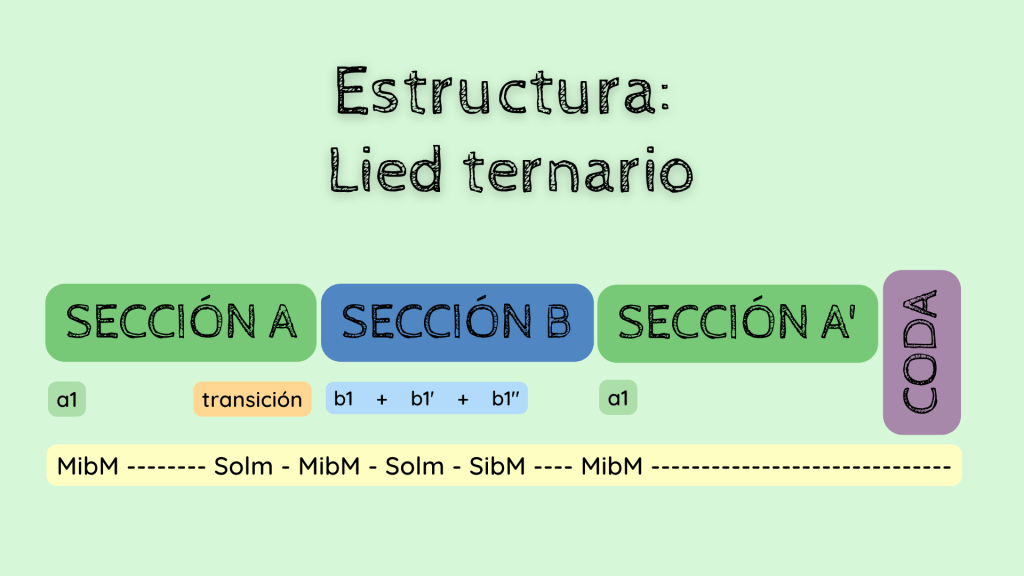 Pues así concluye este análisis. Aquí os dejo, como siempre, este esquema en el que podéis observar el planteamiento tonal. Se trata de un movimiento en forma de Lied Ternario. Aunque en cuanto al material melódico todo el movimiento está bastante unificado. Como texturas hemos visto una alternancia de homofonía (en las frases expositivas), de melodía acompañada (en la transición y coda) y de monodia (en los breves enlaces melódicos a octavas).