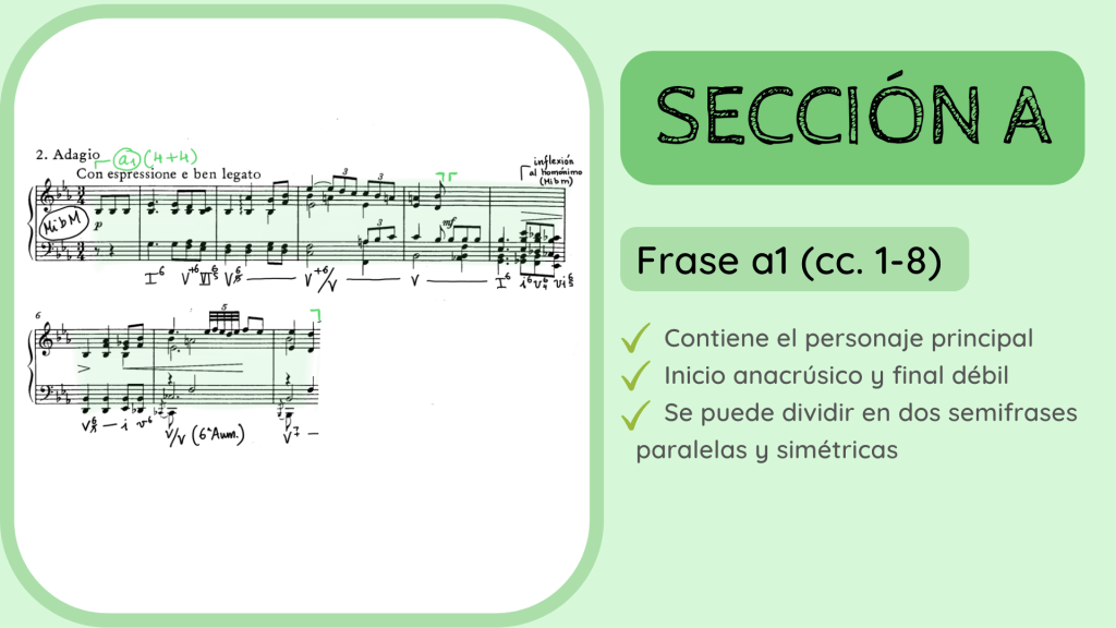 En esta primera frase a1, Clara establece la tonalidad de Mib Mayor y el material melódico-rítmico protagonista. La estructura de la frase binario, simétrica y paralela que encaja en un modelo clásico de 4 + 4. Además también es una frase paralela porque ambas semifrases se inician igual. Ojo pues a ese inicio anacrúsico de tres corcheas ya que tiene una importancia fundamental a lo largo de todo el movimiento. En cuanto a la armonía, en general, es compleja. La velocidad a la que cambian los acordes, es decir, el ritmo armónico, no es constante. Esto dificulta analizar la sintaxis armónica de la cual vamos a destacar varios elementos.