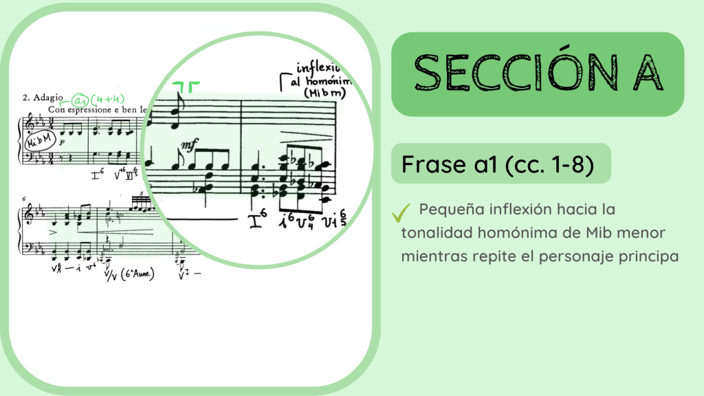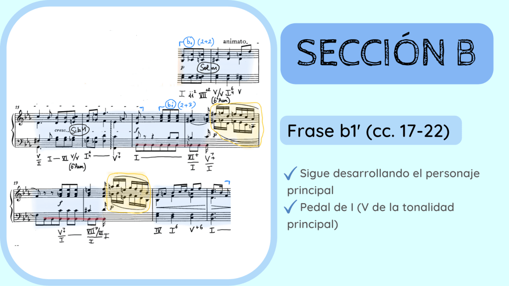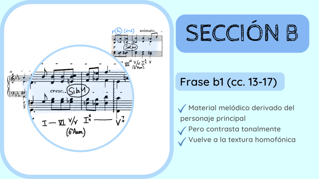 La siguiente frase sigue desarrollando al personaje principal y contiene una pedal de la nota Sib; de la tónica.
