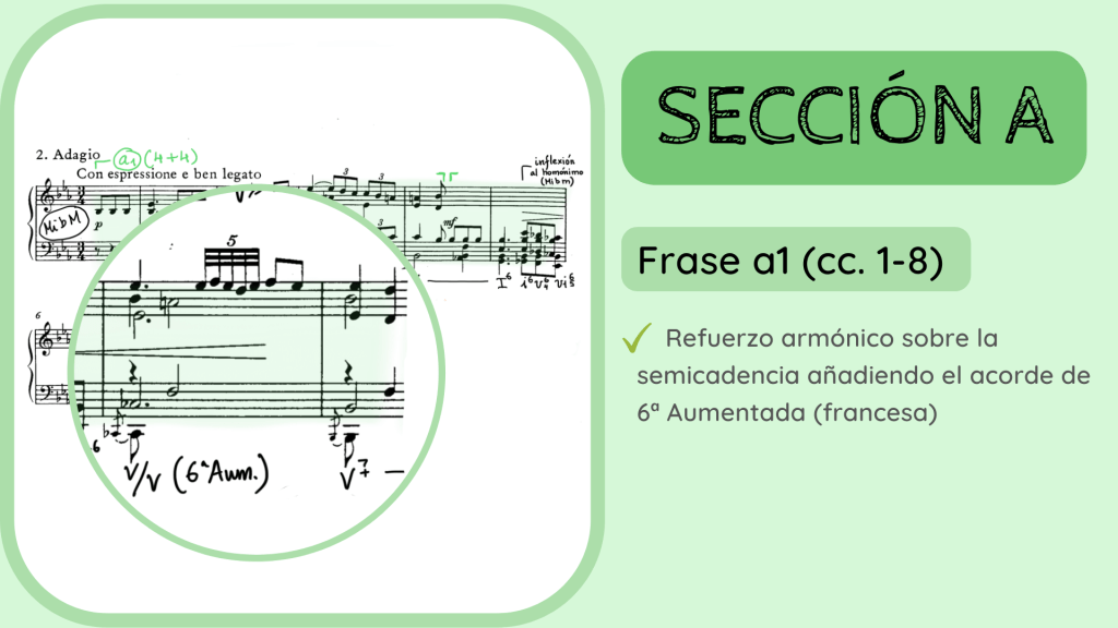 El otro elemento interesante es el acorde de armonía alterada. Una 6ª Aumentada de tipo francesa. No hace más que reforzar la nota Sib como V de la tonalidad principal. Además, marca un claro camino en la línea del bajo que hace: Mib-Reb-Dob-Sib para darle más fuerza a la semicadencia de la frase.