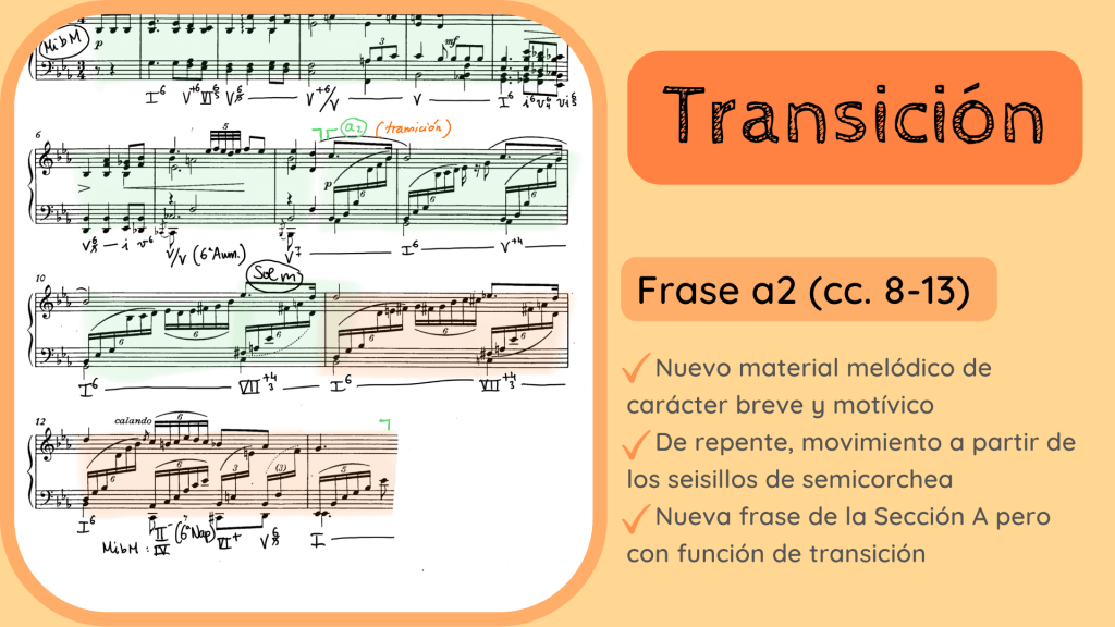 La nueva frase a2 presenta unas características por las que se le puede asignar una función de transición. Es decir, que no se trata únicamente de un nuevo tema melódico presentado en la tonalidad principal. La característica más remarcable es el dinamismo que aporta a través de los seisillos de semicorchea. Además, se desvía tonalmente hacia Sol menor y presenta un nuevo motivo melódico basado en la apoyatura de corchea con puntillo que resuelve en una blanca. Con ella se genera una especie de progresión melódica.