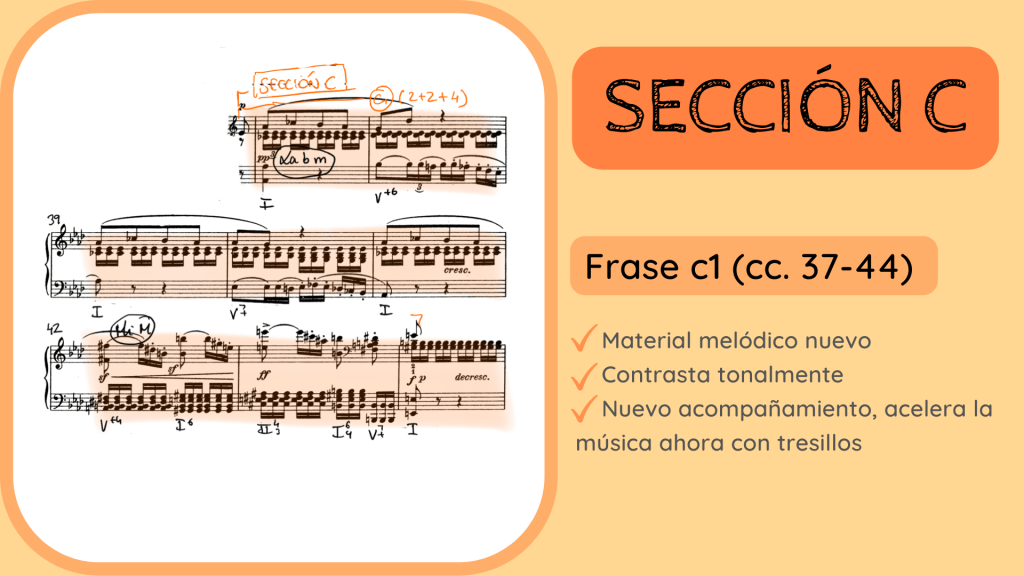 De nuevo con carácter anacrúsico, se inicia otra melodía, aunque por su brevedad podríamos definirla como motivo. De forma abrupta, con el Dob modulamos hacia la tonalidad homónima de Lab Mayor, es decir, Lab menor. Se establece la nueva Sección C con su frase c1 que tiene una estructura clásica de 2+2+4.