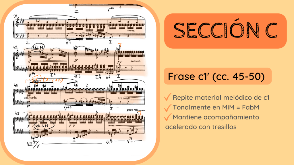 Nueva frase c1’ puesto que reutiliza el mismo motivo de antes. Mismo acompañamiento también pero ahora, tonalmente, vuelve a usar una enarmonía para en el c. 48 preparar ya la vuelta a Lab Mayor, a la tonalidad principal. Puesto que Lab menor, la tonalidad de la que proviene, y Lab Mayor, la tonalidad a la que quiere ir, son tonalidades homónimas Beethoven lo tiene fácil para preparar el terreno. Los cc. 48-49 son una dominante de la dominante, que acaba resolviendo en el c.50 en un acorde apoyatura de la dominante pero que se puede analizar como un II. En la segunda mitad del c. 50 aparece por fin la dominante que da pie a la siguiente Sección.