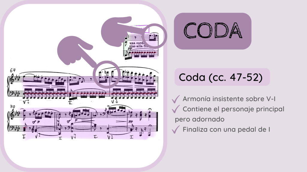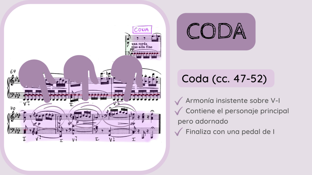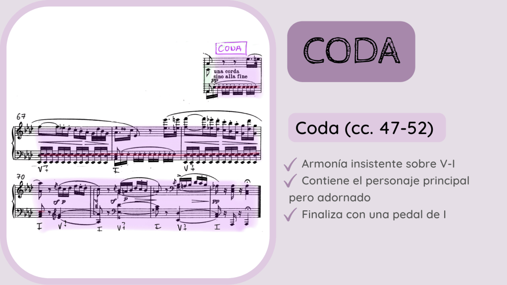 Así, tras la fuerte Cadencia Auténtica se inicia ya la última Sección que posee las características típicas de una Coda. Por un lado, la armonía que alterna los acordes de V y I de forma insistente. Por otro lado, dos motivos que se repiten y que tienen un claro carácter descendente y conclusivo.