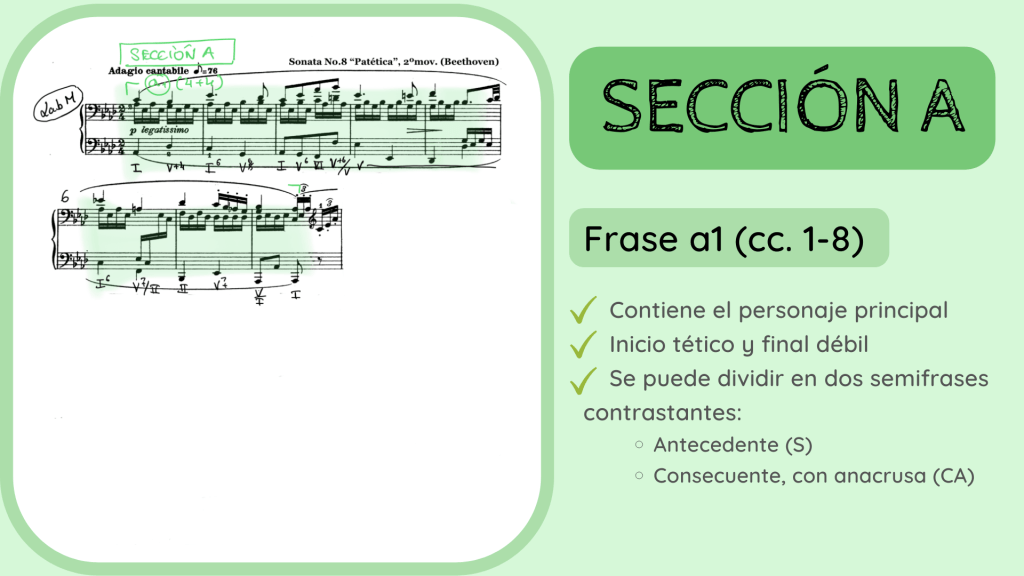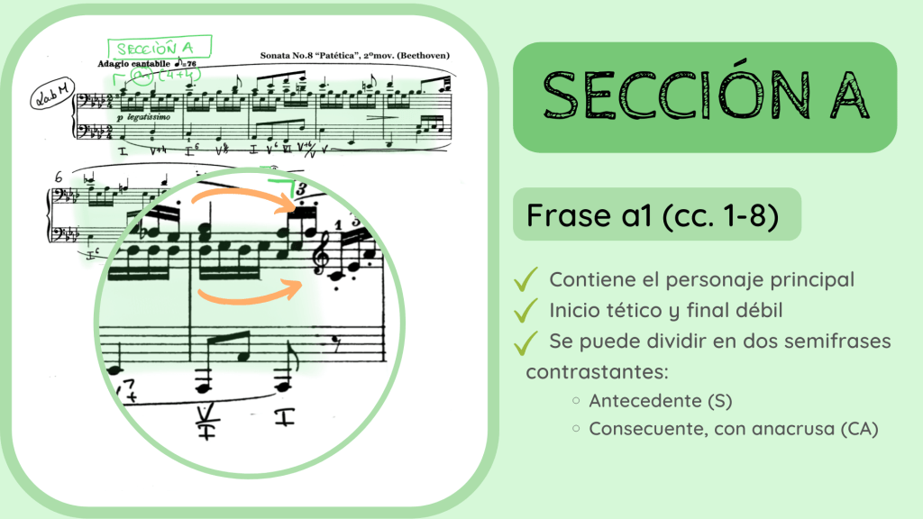 En esta primera frase, que he llamado a1, Beethoven establece la tonalidad de Lab Mayor y el material melódico-rítmico protagonista. La estructura de la frase es simétrica y encaja en un modelo clásico de 4 + 4. Aunque cabe señalar que el inicio de la primera semifrase es tético mientras que la segunda tiene un inicio anacrúsico (aunque algunos podrían pensar que el Mi natural del c. 4 es un enlace).