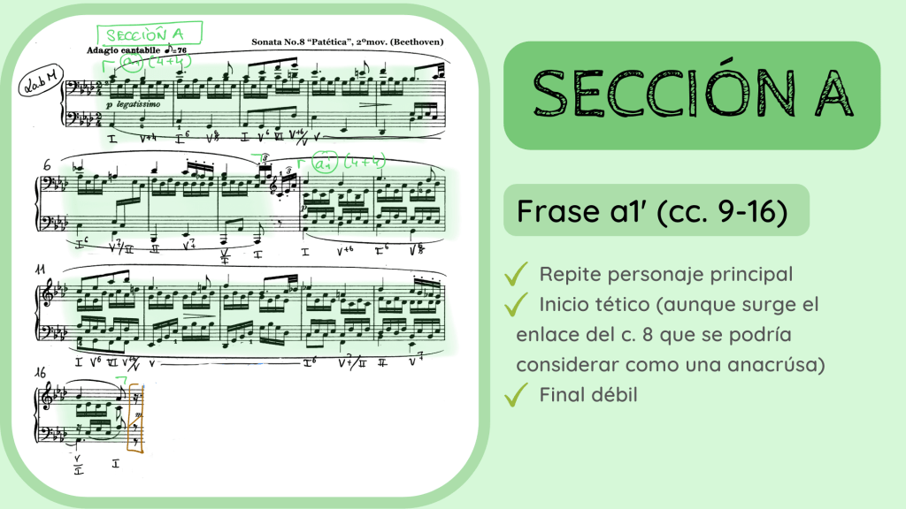 Tenemos un pequeño enlace melódico que cubre el hueco entre el c. 8 y el inicio tético de la nueva frase. Tras él, se inicia así una repetición del mismo personaje melódico, por eso la he llamado como frase a1’. Posee la misma melodía y mismo bajo armónico, pero ahora la melodía y el acompañamiento son más plenos, ocupan un mayor registro sobre el piano. La frase anterior era más recogida, ambas manos del pianista estaban escritas en claves de Fa. Ahora la melodía suena a una octava superior y el acompañamiento realiza arpegios que rellenan más todo el registro medio-grave del instrumento.
