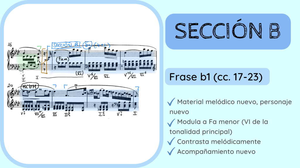 Una nueva melodía anacrúsica aparece. De forma abrupta cambia el carácter de la música por ese VI de Lab Mayor que con el Mi natural del c. 18 se confirma como modulación. Es decir, cambia Fa menor. Se puede escribir como modulación o, como podéis observar, como dominantes secundarias del VI. Lo mismo es. Aunque para ser más exactos, tratándose de un cambio de Sección convendría cambiar directamente la tonalidad a Fa menor. De todas formas, la frase acaba por confirmar la tonalidad de Mib Mayor en los cc. 21-23 realizando el habitual proceso cadencial que se compone de un II, seguido del I en sexta y cuarta cadencial, la V y la I de nuevo en tiempo fuerte.