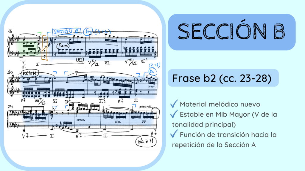 La siguiente frase b2 es nueva. Se inicia de forma acéfala y es estable sobre Mib Mayor. Su línea del bajo y armonía son una alternancia de I y V. Contiene ese motivo descendente cromático del c. 24 que se repite hasta tres veces. Dicho motivo es el que, sutilmente, en la última semicorchea del c. 28 hace aparecer la nota Reb. Esa nota, que forma una 7ª menor con respecto al bajo, hace surgir la sonoridad del acorde de séptima de dominante y, por tanto, la modulación hacia la tonalidad principal de Lab Mayor. Interpretativamente hablando esa semicorchea Reb será muy importante resaltarla, darle protagonismo.