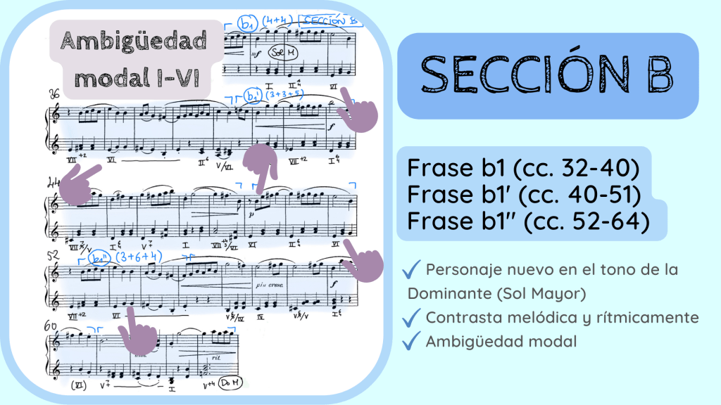 Se suceden tres frase b1 seguidas que rompen la clara y sencilla fraseología de la Sección A y dan lugar a algunas frases ternarias y asimétricas. Pero en cualquier caso, se tratan de frases que melódica y rítmicamente están relacionadas entre ellas, sobre todo en sus inicios anacrúsicos y por ello se han denominado como b1, b1’ y b1’’.