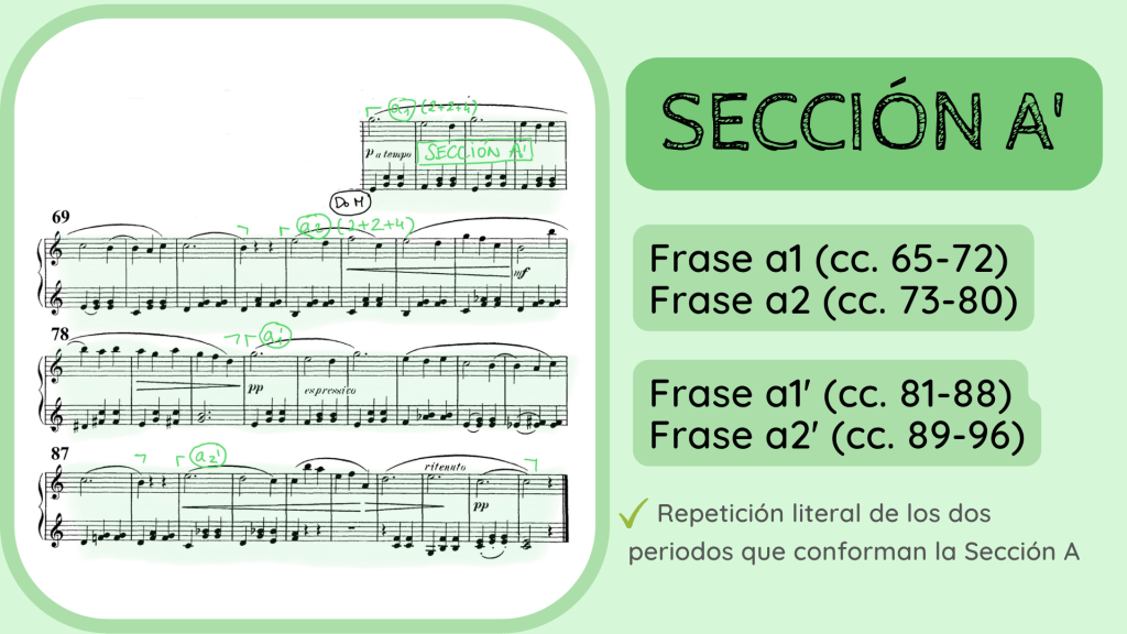Por último, surge toda la Sección A que se repite literalmente, sin variaciones, con sus dos periodos binarios, contrastantes y simétricos.