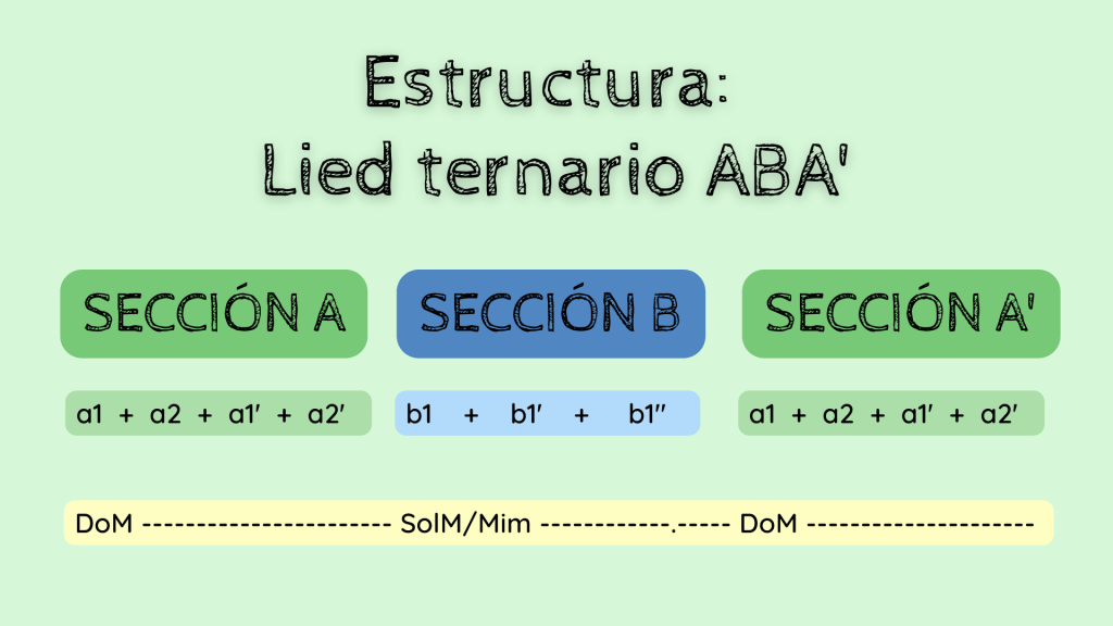 Así concluiría este análisis. Aquí os dejo, como siempre, con este esquema en el que podéis observar el planteamiento tonal de la pieza. Se ve así como se trata de una forma de Lied Ternario. En cuanto a las texturas de la pieza destaca, como predominante, la melodía acompañada. Aunque como hemos señalado, hay un par de breves momentos de monodia.