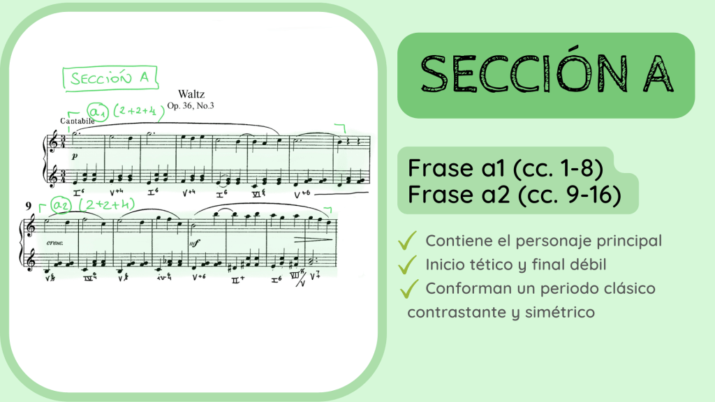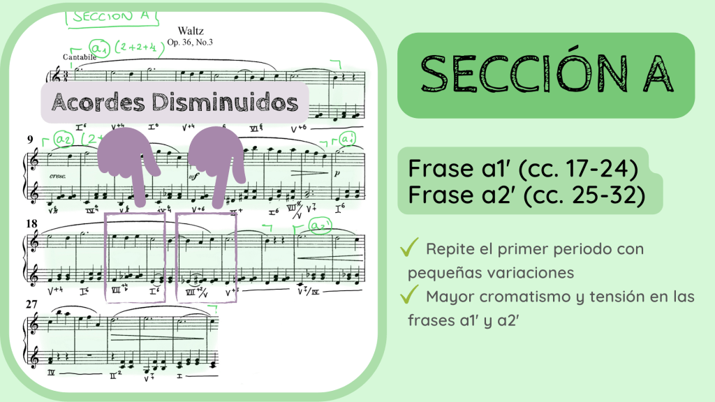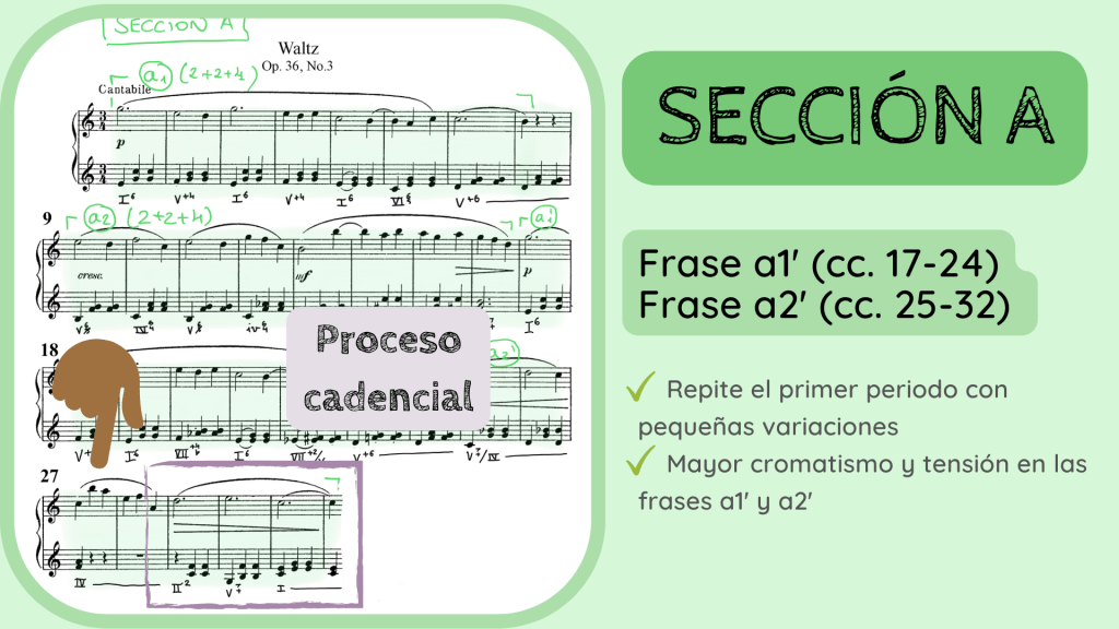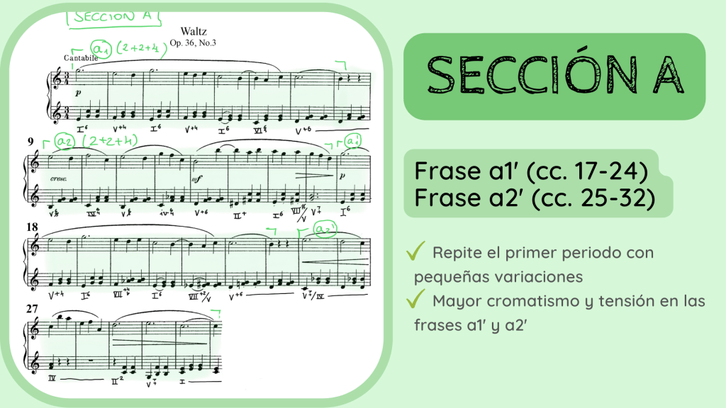 Prosiguiendo con la melodía, surgen otras dos frases que mucho tienen que ver con las anteriores ya que son como una derivación o variación, por eso las denomino como a1’ y a2’. Vuelven a formar entre ellas otro periodo de carácter clásico que podríamos etiquetar como binario, contrastante y simétrico.