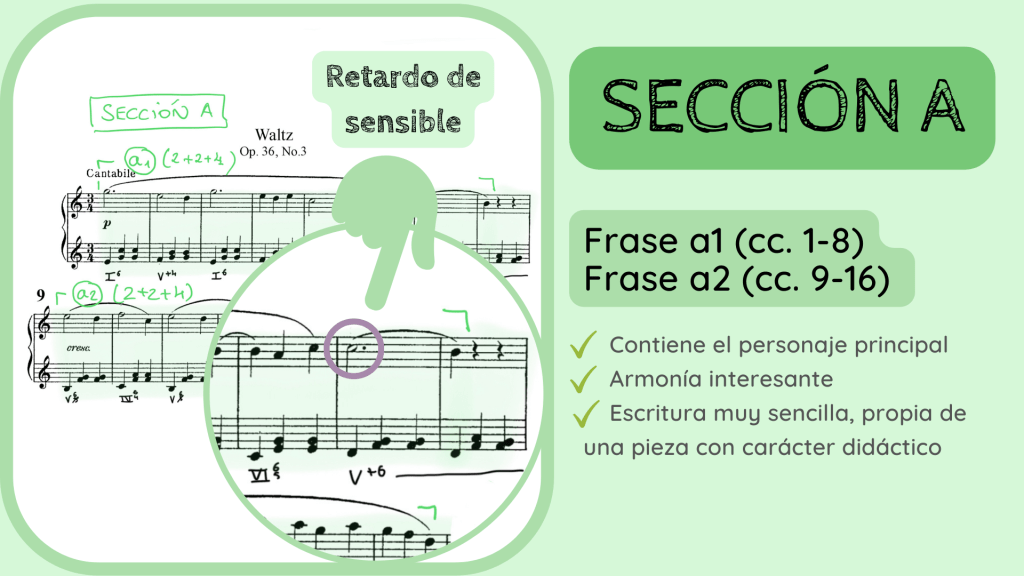 Al final de la primera frase encontramos otro elemento típico de la tradición tonal desde tiempos barrocos, un proceso conocido como retardo de sensible. Es decir, sobre el acorde de dominante, se retarda la nota Sensible (en este caso Si) por la Tónica (que se queda como disonancia sobre la Dominante en tiempo fuerte).