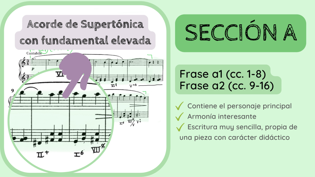 Para finalizar este segundo periodo y también toda esta primera Sección A, en el c. 27 encontramos un descanso. El acompañamiento que no había parado hasta ahora desaparece momentáneamente y la melodía realiza un salto para luego descender y volver al mismo registro. Este pequeño respiro y su armonización posterior de proceso cadencial (con los grados: II con séptima diatónica, V y I) marcan, sin lugar a dudas, un gesto final. Además, la melodía realiza una nota extraña típica de giro de final de fraseo, me refiero al Mi del c. 30, una nota extraña que se puede definir como escapada de mediante.