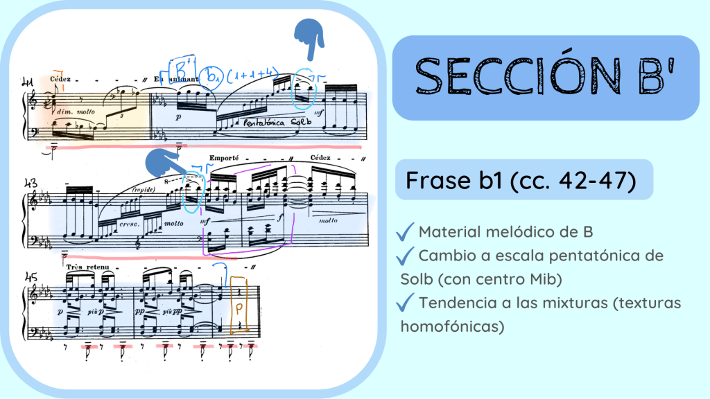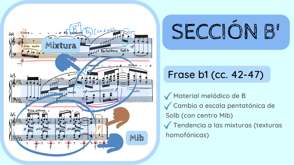 De nuevo las secciones acaban conectadas por un enlace, esta vez el c. 41. Aparece un tema que, por sus características interválicas es muy similar al de la Sección B pero esta vez está escrito en otra escala, la de Solb. A pesar del fuerte contraste que genera dicho cambio de escala y su sonoridad, las características melódicas me han llevado a decidir que este fragmento se trataba de la Sección B’.