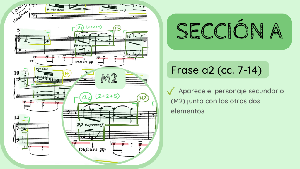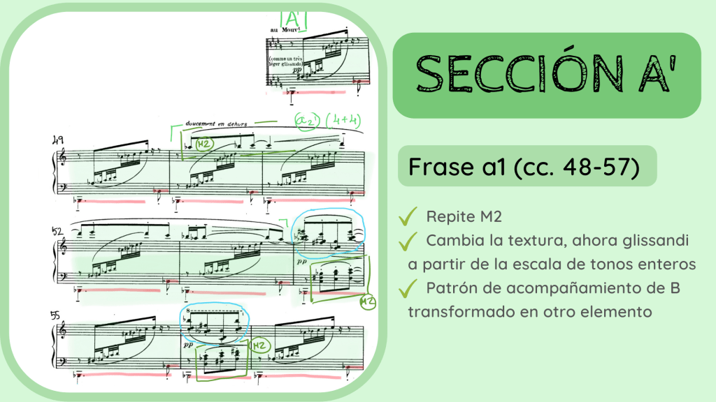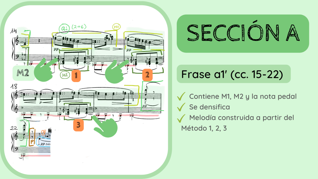 La siguiente frase a1’ prosigue con esta combinación de los elementos pero ahora con una mayor densidad. Se vuelve a repetir el Método 1, 2, 3 como recurso para estructurar la melodía pero ahora el Motivo 2 presenta una sucesión de acordes paralelos. Es decir, otra vez uso de mixtura. En esta ocasión, los acordes están formados por 3as Mayores superpuestas, lo que generan acordes de 5ª Aumentada, con su sonoridad tan característica.