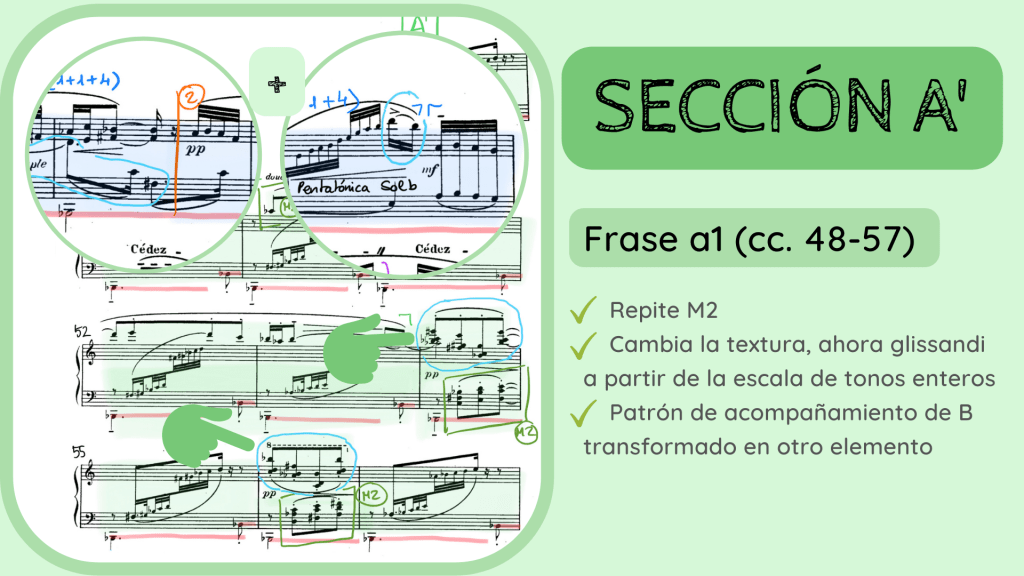 Podéis ver cómo de dos elementos anteriores de ambas secciones B surge el elemento nuevo. Una mixtura de acordes cuya formación es una 2ª Mayor más otro intervalo extenso que a veces se trata de una 5ª, 6ª o 7ª según le interesa al compositor. Esta construcción acórdica proviene del patrón de acompañamiento de la Sección B. Y el movimiento de los acordes con una 3ª Mayor descendente también deriva del elemento que señalamos de la Sección B’ y que tenéis en el círculo superior derecho.