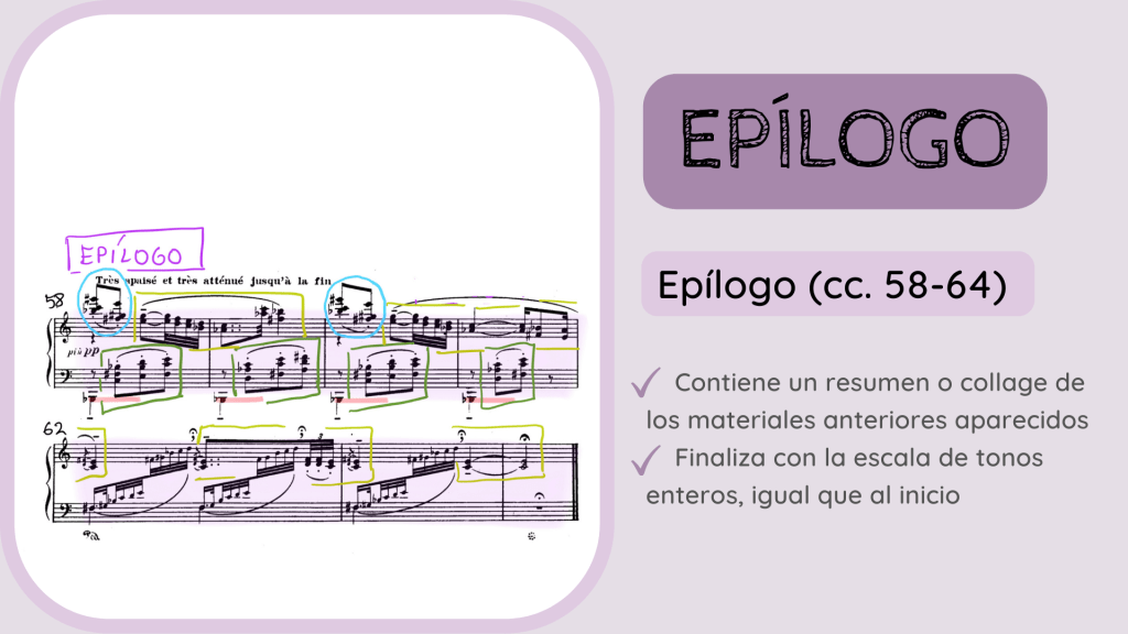 Para finalizar Debussy presenta esta Coda que, por sus características de resumen de ideas o collage de motivos ya presentados en toda la obra, le hemos denominado como Epílogo. Como podéis observar encontramos una acumulación de ideas: primero, vuelve al Motivo 1 como elemento melódico principal, aparece también el Motivo 2 como acompañamiento (el cual, por cierto, se va desvaneciendo junto con todo el epílogo, que en su avance va desapareciendo). También encontramos los glissandi de la última Sección A, la nota pedal Sib y, por último, el motivo desarrollado de antes que también se reutiliza aquí, marcado en azul. Por todo ello, más que una Coda, el término apropiado para esta sección final es el de epílogo.