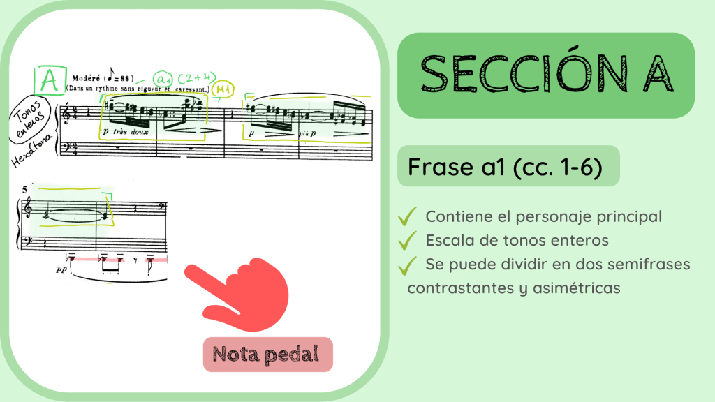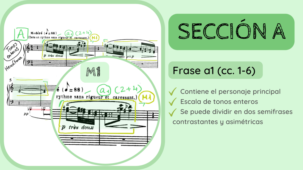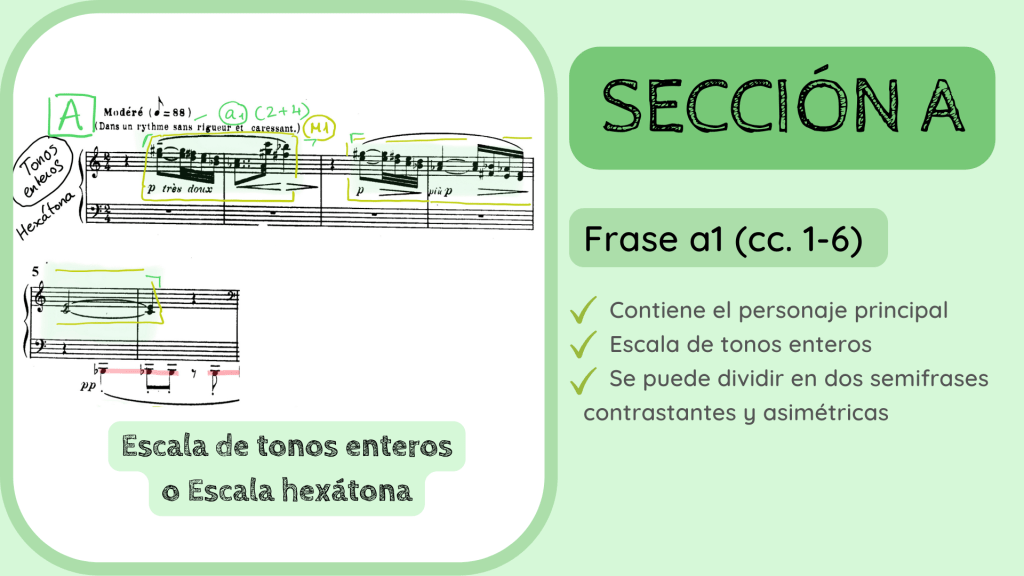Centrándonos ya en el inicio del preludio Debussy presenta en esta primera frase a1, un material melódico-rítmico. Por el uso de las alteraciones se puede observar que está escrito en la Escala de tonos enteros o también conocida como Escala Hexátona. Dicha escala tiene una sonoridad muy especial precisamente por su característica más notoria, que no tiene semitonos. Ello la convierte en una escala que vaga sin rumbo ni descanso ya que, en ausencia de semitonos, no existe ninguna atracción o jerarquía entre sus notas o grados (como sí ocurre en otras escalas). Por lo tanto, da la sensación de sonoridad volátil, de no direccionalidad ni tónica.