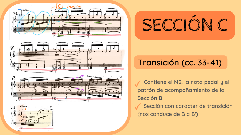 El hecho de hablar de esta Sección C como una transición es por dos motivos: por un lado elabora melódicamente el Motivo 2 y el acompañamiento de B (es decir, reutiliza material que no es nuevo) y, por otro lado, nos conduce de la Sección B a la siguiente Sección B’. Es decir, que actúa de engranaje entre las dos secciones B.