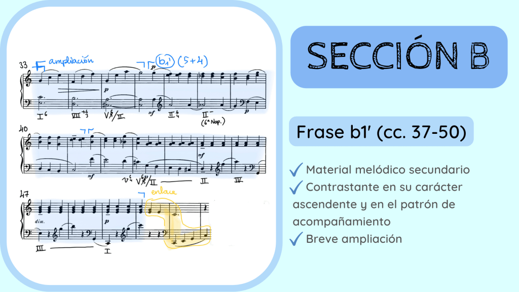 Se presenta ahora una nueva frase b1’, puesto que ésta deriva de la anterior, y es también asimétrica pero esta vez de estructura binaria. Como se puede observar, el compositor mantiene un carácter descendente y diatónico en la melodía. Incluso podemos observar como los distintos acordes formados por dos notas, es decir, por dos voces, también se mueven por movimientos diatónicos entre ellos.