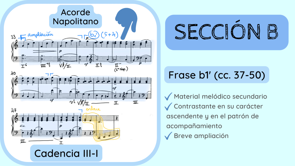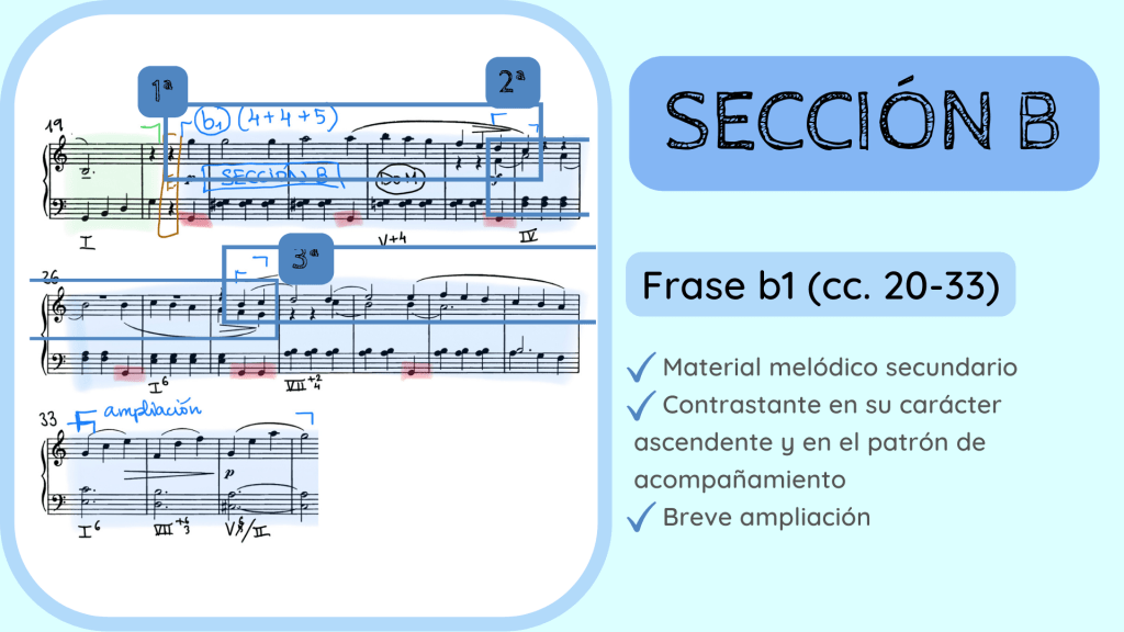Al margen del estilo, lo que es inequívoco es la breve separación del c. 20, un silencio estructural entre la Sección A y la nueva Sección B que contendrá un nuevo personaje melódico-rítmico. Vaya, que podríamos considerar que la repetición de la frase a1’ ha sido prácticamente un elemento de transición hacia el nuevo centro de Sol Mayor.