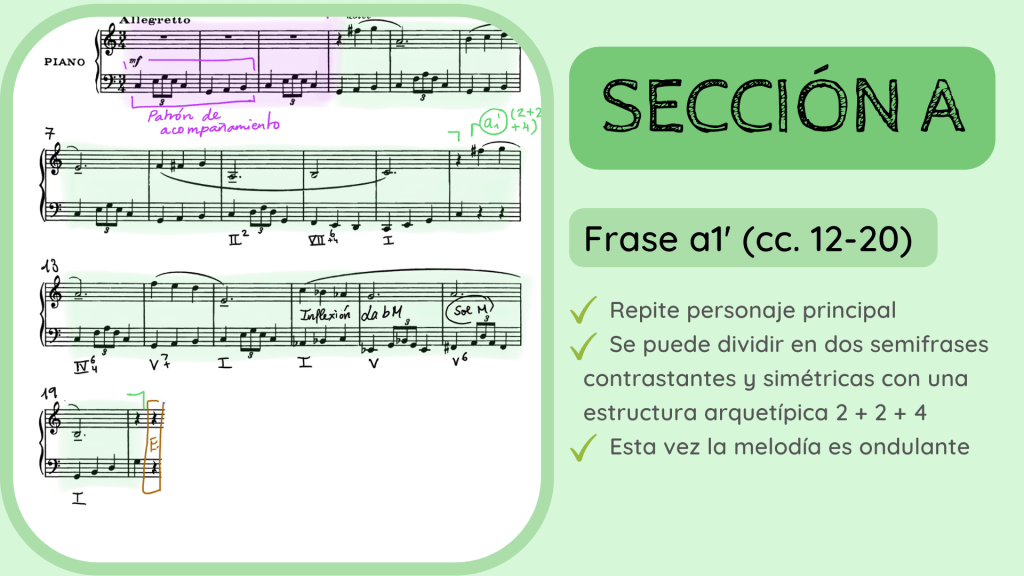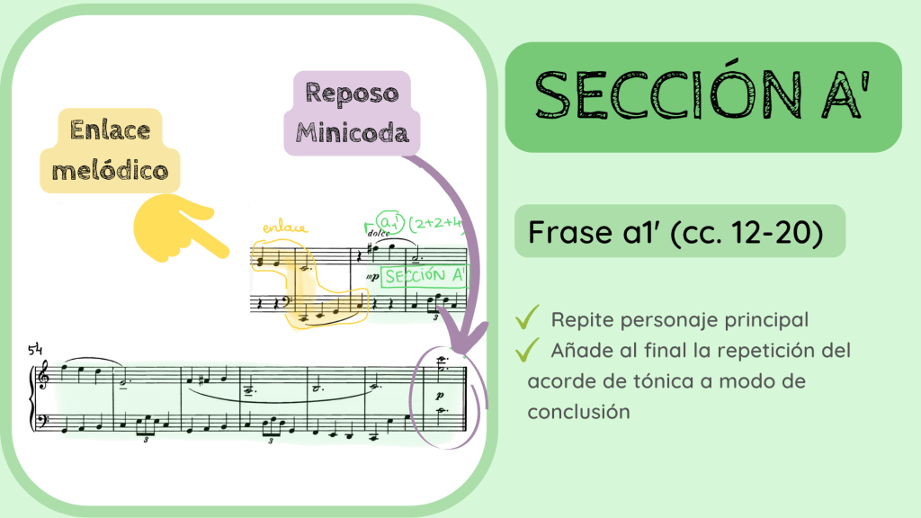 Tras dicha cadencia con un fuerte carácter conclusivo seguida de un breve enlace melódico que supone una ampliación del acorde de tónica, aparece la reexposición de la frase a1 y, por tanto, la Sección A’. Es exactamente igual que al inicio, una repetición literal. Solamente cabe destacar el acorde del final, una confirmación del acorde de tónica y una suerte de coda. Bueno, minicoda.