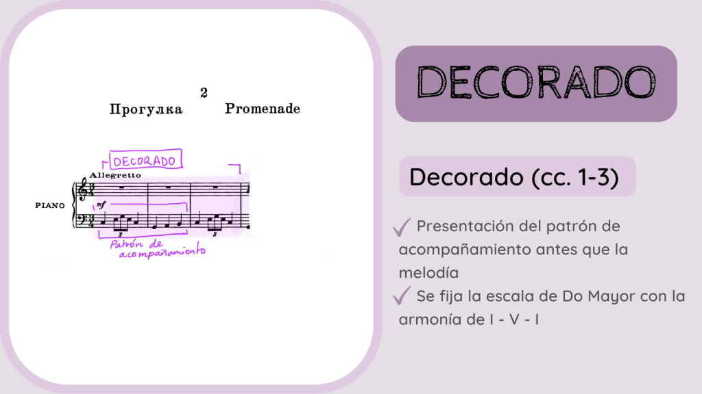 Este primer fragmento se trata de una introducción. No obstante, por ser únicamente una presentación de un patrón de acompañamiento sin melodía la he denominado como Decorado. Su función es clara, mostrar de forma inequívoca el modelo melódico-rítmico que luego se irá transformando a través de los distintos acordes.