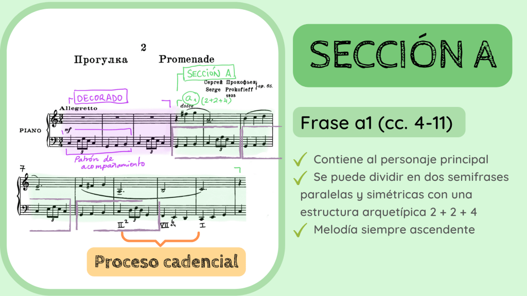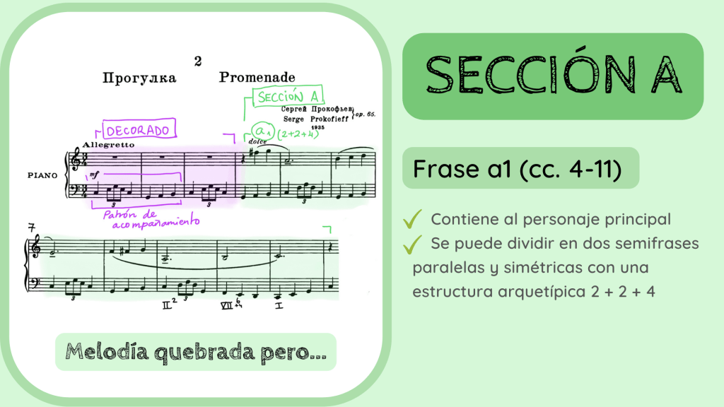 De inicio anacrúsico, la melodía se inicia con una estructura arquetípica de 2 + 2 + 4. Se trata de dos semifrases simétricas y paralelas, puesto que empiezan igual. Ambas terminan reposando sobre la tónica, en los cc. 7 y 11. La línea melódica principal que se encuentra todo el rato en la voz superior es, en esencia, también sencilla. Tiene un perfil quebrado, con grandes saltos, característico del lenguaje de Prokofiev y mayormente diatónico, a excepción de los cromatismos entre Fa#-Sol. Aunque, si prestamos atención, la melodía es mucho más simple de lo que parece…