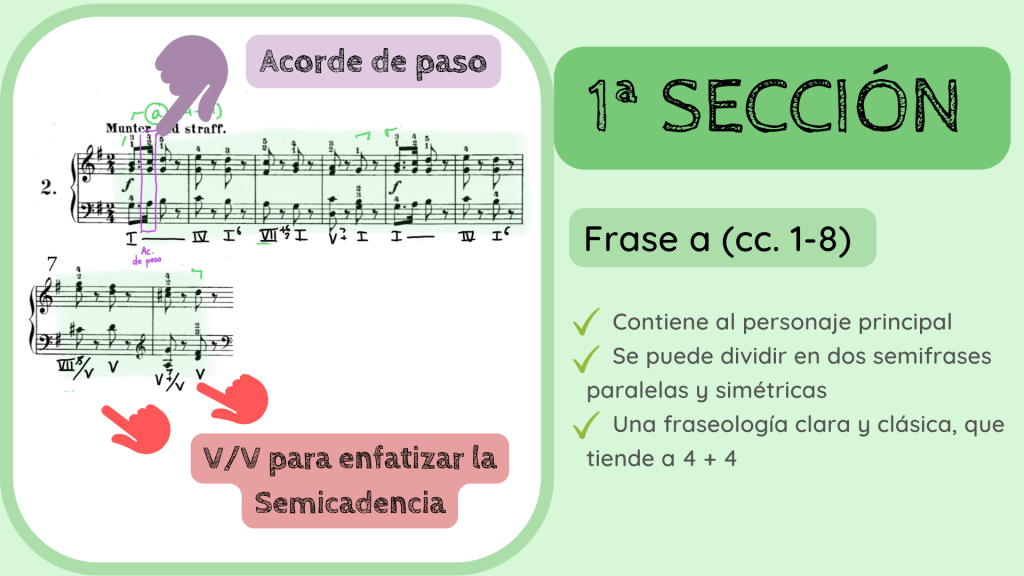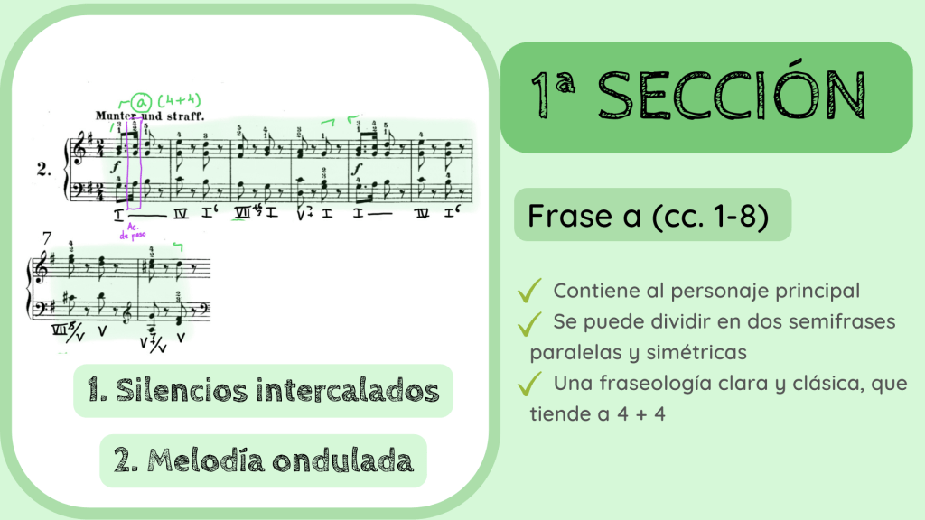 En esta primera frase, que he llamado a, se establece la tonalidad de Sol Mayor y el material melódico-rítmico protagonista. De inicio tético, es decir, en tiempo fuerte, la melodía se inicia con una estructura arquetípica de 4 + 4. Se trata de dos semifrases simétricas y paralelas, puesto que empiezan exactamente igual. Ambas terminan sobre la semicadencia, en los cc. 4 y 8. La línea melódica principal que se encuentra todo el rato en la voz superior es, en esencia, también sencilla porque está realizando un movimiento ascendente seguido de uno descendente, con un perfil ondulante y mayormente de carácter diatónico.