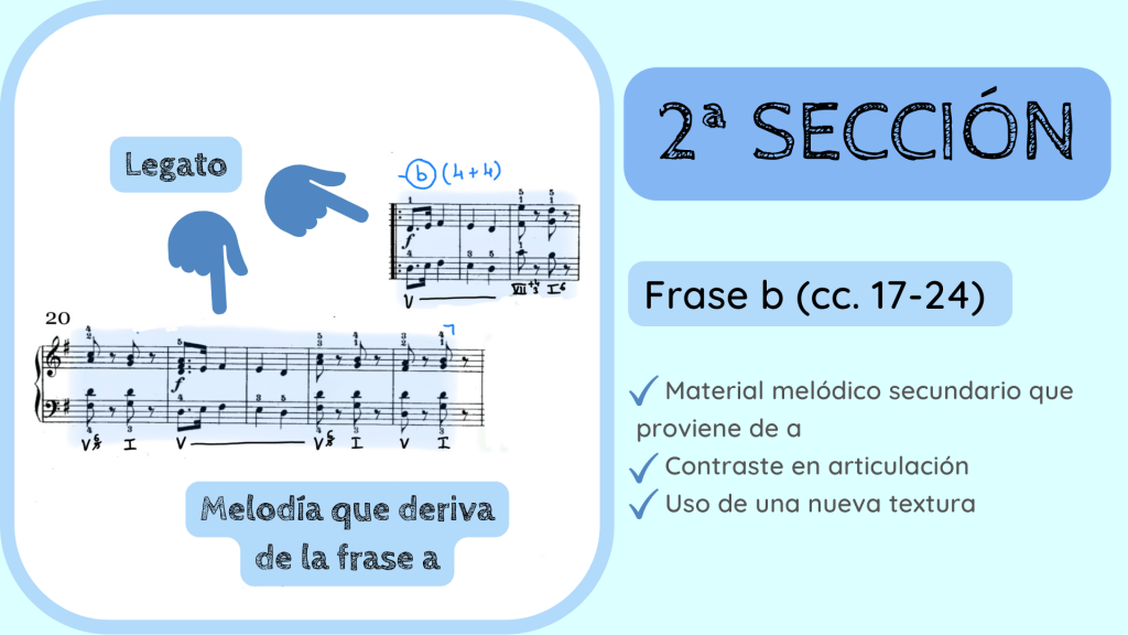 La armonía continúa siendo sencilla. La melodía deriva en gran medida de la frase a pero ahora se presenta con grandes saltos melódicos, como el de 9ª Mayor que se produce entre los cc. 19-20. Esta frase sigue siendo muy clara y simétrica, como la anterior, presentando de nuevo una estructura interna de dos semifrases en 4 + 4.